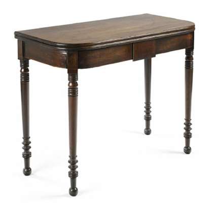 the foldover top with a moulded edge and central banded tablet to the frieze and satinwood banding, on ring turned tapered legs ending in later ball feet
