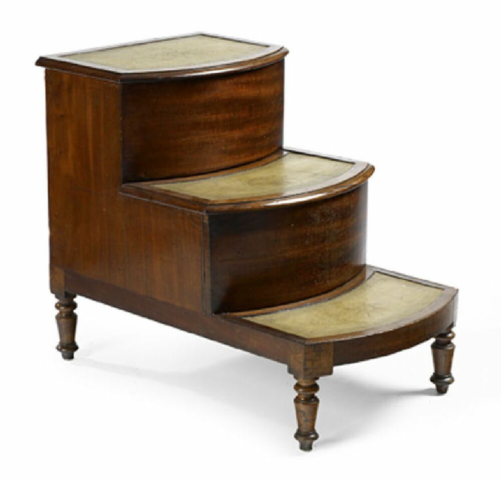 incorporating a control sliding lidded commode step, the bowfront moulded treads each with a gilt tooled green leather inset, on short turned tapered legs