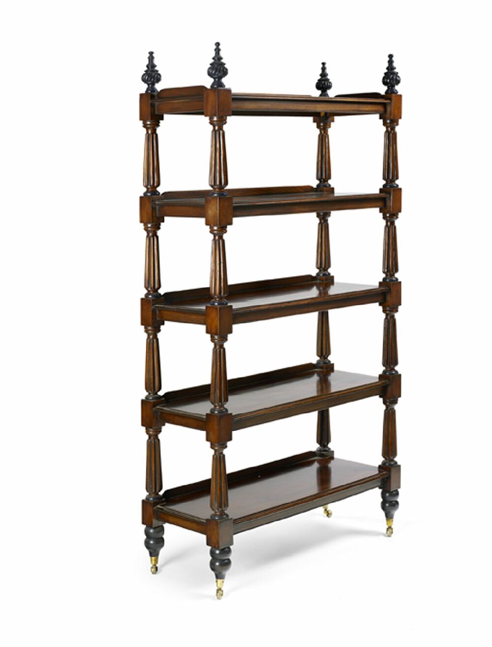 comprising five rectangular tiers between reeded baluster turned supports with urn finials, on baluster turned legs with brass caps and castors