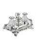 the stand of shaped oval outline with heavy scroll formed border and pierced scroll inner border, with two faceted glass baluster bottles, one inkwell and other powder pot, with foliate scroll borders and central chamber stick on stand