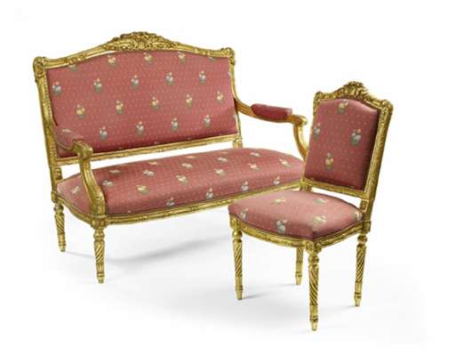 a two seater settee and a pair of chairs, the padded open arms, seats and backs covered in floral patterned pink fabric, the gilt foliate tied reeded moulded frames with floral basket crestings, paterae and acanthus leaf carving, on lotus leaf carved spiral fluted tapered legs (3)