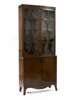 inlaid with ebonised stringing, the fluted and paterae carved cornice above a pair of diamond and demi-lune glazed doors enclosing shelves, the lower section with a pair of oval panel cupboard doors enclosing a shelf, on a shaped apron with splayed bracket feet (alterations)