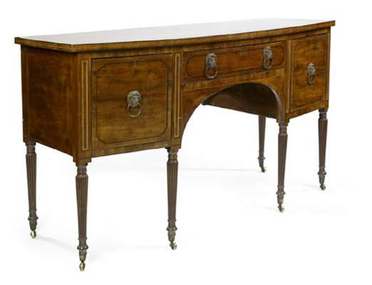 inlaid with ebonised stringing, the central drawer flanked by two deep drawers with lion's head handles, right drawer with bottle divisions, on turned reeded tapered legs ending in brass caps and castors