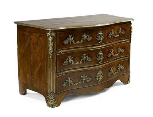the featherbanded and crossbanded top with parquetry lozenges and a gilt brass moulded edge, above three long drawers with ornate mask and scrolling foliate handles flanked by fluted rounded corners, the shaped sides quarter veneered and with lozenge banding, on bracket feet with anthemion scroll mounts and a shaped apron