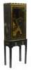 the rectangular top with wavy gallery above two cupboard doors decorated with chinoiserie rock and pavilion, within scrolling foliate border, enclosing drawers, the base with two long drawers, on chamfered square legs