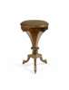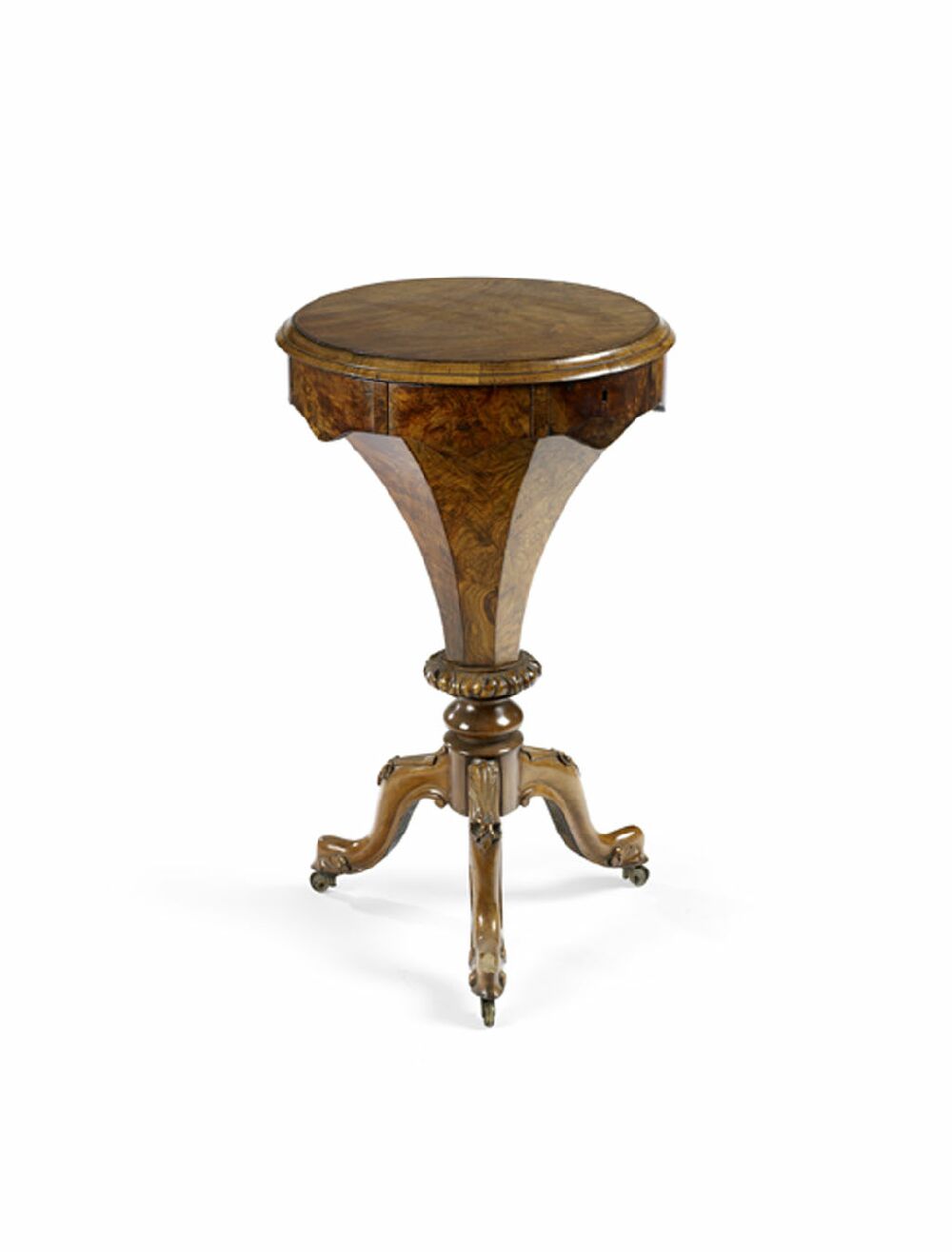 the circular moulded hinged top revealing a fabric lined interior, the shaped apron on a tapered leaf carved stem with triple leaf carved moulded cabriole legs with brass castors