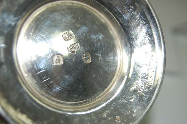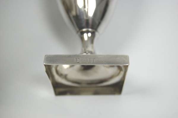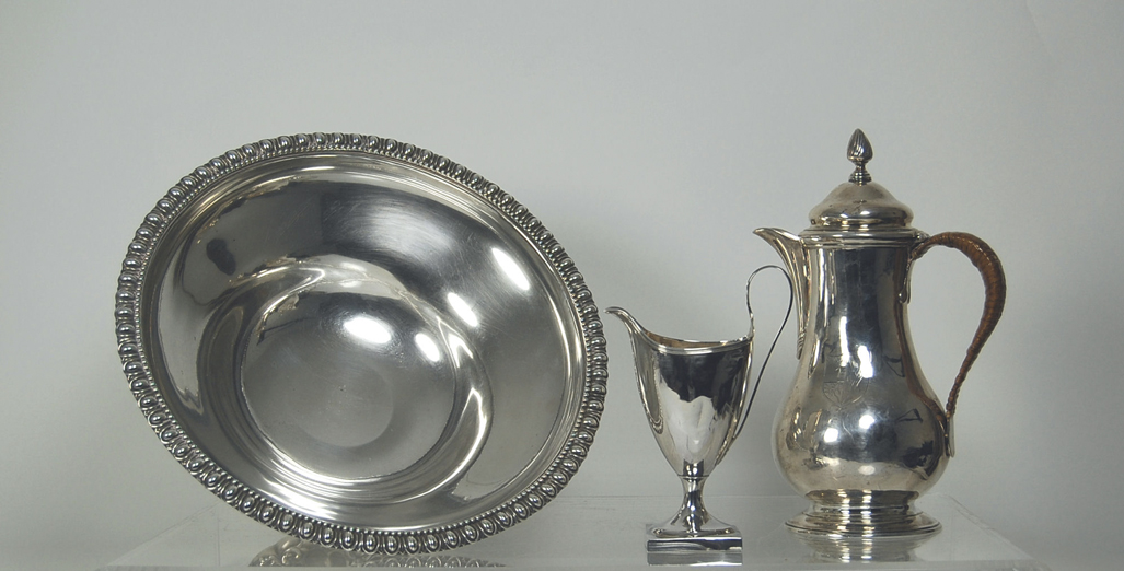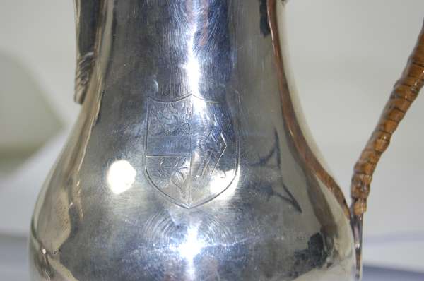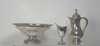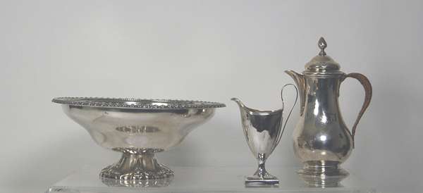 of slender baluster form with engraved armorial and reeded V neck spout, the domed hinged lid with semi spiraled finial, the simple S scroll handle with wicker covering; a helmet form cream jug London 1792, of typical form with simple reeded rim and C scroll handle; together with a large plated punch bowl, the plain bowl with ovolo and beaded rim and on a spreading scroll formed foot (3)