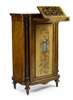 inlaid with stringing and crossbanding, the mirror burr veneered breakfront top above a frieze drawer revealing an openwork ratchet adjustable music stand, above a locked cupboard door with a penwork panel depicting a 17th century boy in a foliate surround, flanked by turned corner columns and raised on baluster feet with ceramic castors