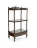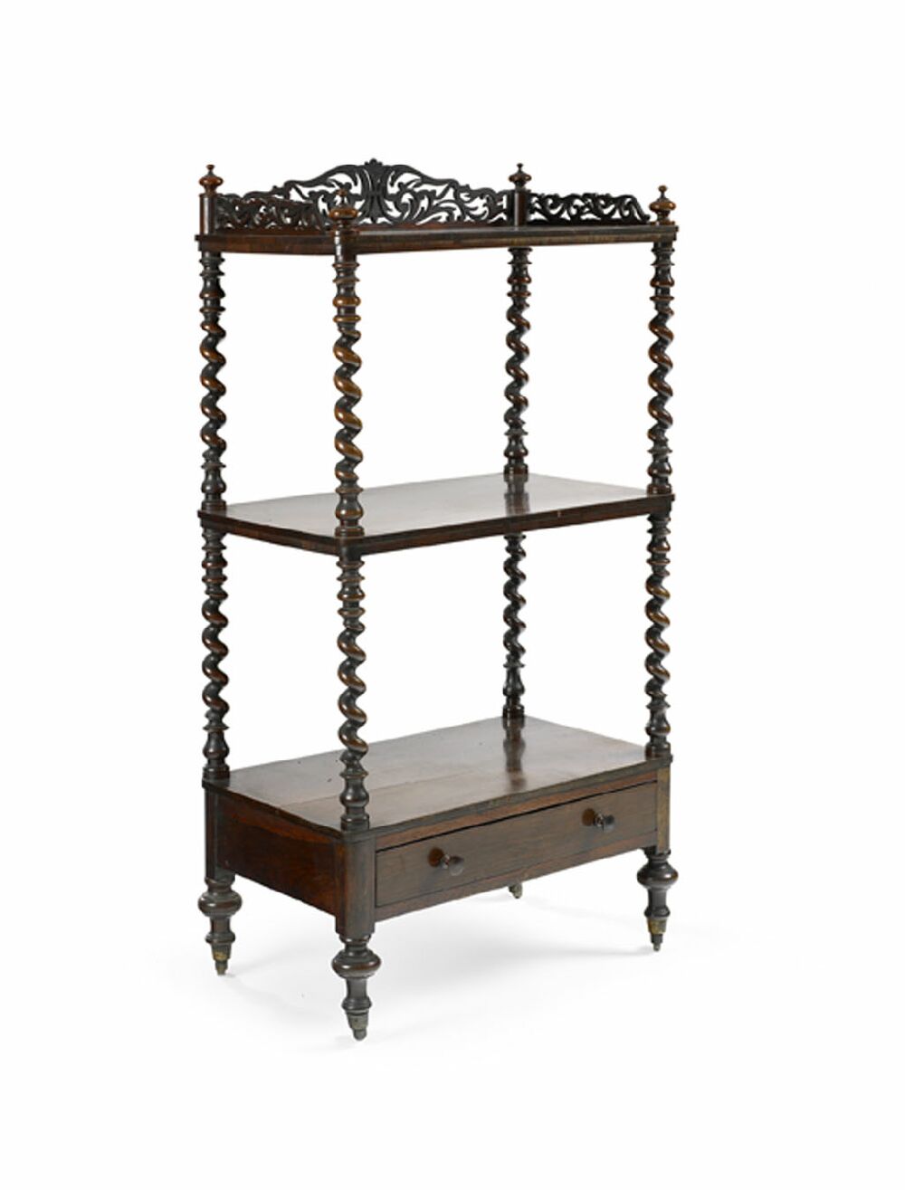 the foliate pierced, three quarter galleried top on spiral twist supports, the lower tier with a drawer and short turned legs with brass caps and castors
