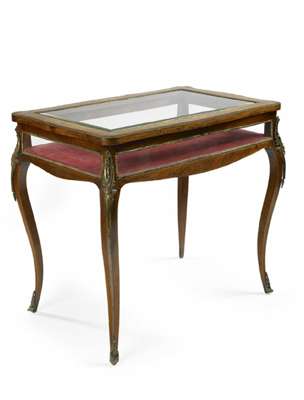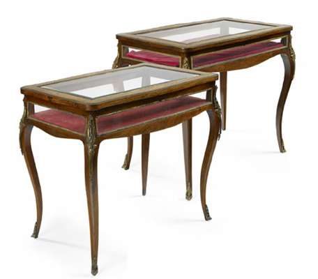 A pair of late 19th century French rosewood and marquetry table vitrines