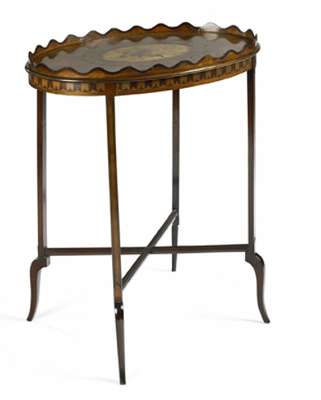 the satinwood and rosewood carved gallery enclosing a central musical trophy oval, the dot inlaid chequer banded frieze, on square legs joined by an X-form stretcher and ending in cabriole legs