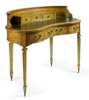 of freestanding form, inlaid throughout with trailing husks and bell flowers, the shaped curved superstructure incorporating three small drawers above a tooled green leather inset top, above a central drawer flanked by a pair of smaller drawers, on Ionic capped square tapered legs ending in spade feet with brass castors