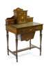 inlaid with stringing and fan medallion, the superstructure of a central cupboard door flanked by a pair of drawers above a leather insert, frieze drawer and needle work drawer, on tapered turned legs joined by stretchers