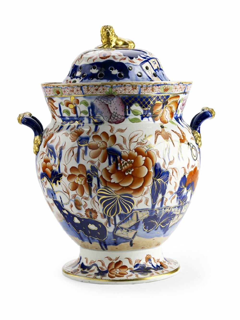 of baluster form, the pierced cover with gilt lion finial, boldly decorated with flowers in the Imari palette