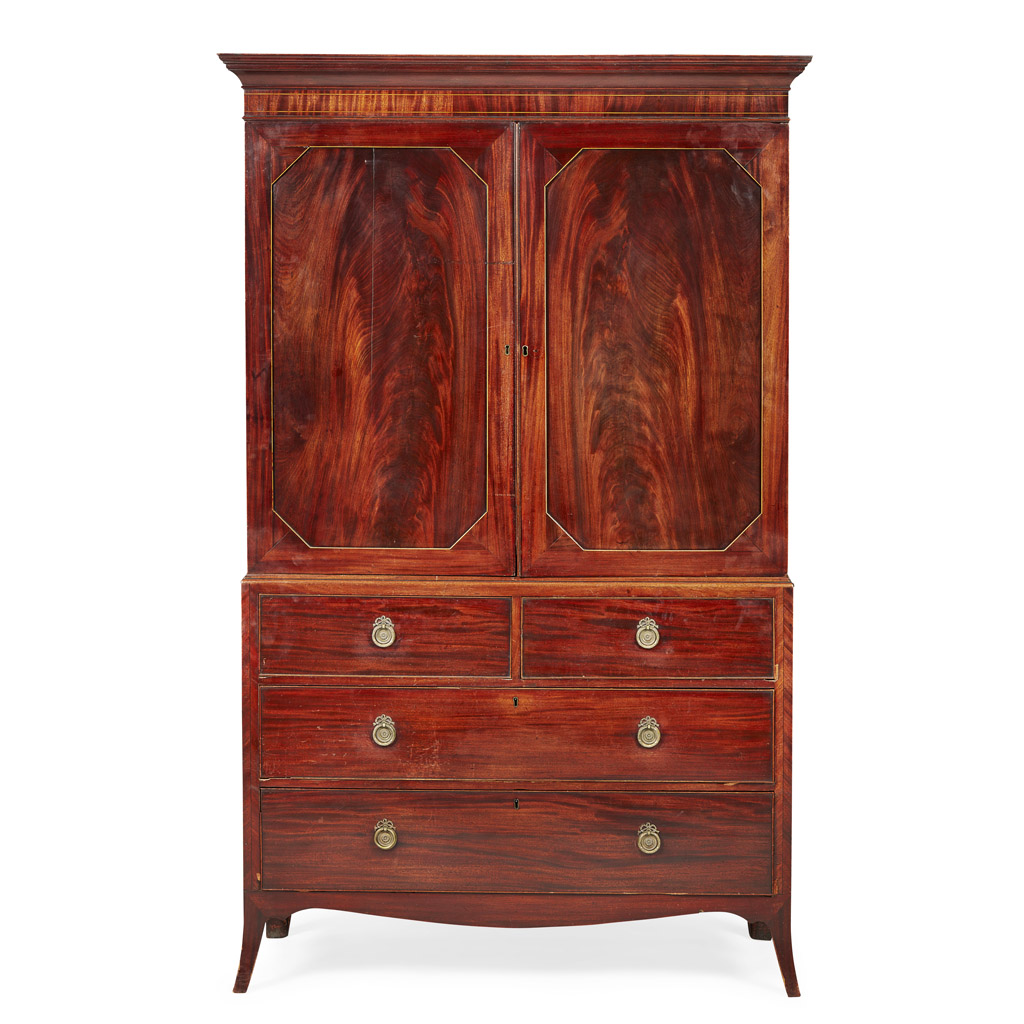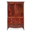 the moulded cornice above a pair of cupboard doors opening to hanging space; the lower part with two short over two long drawers, raised on splayed feet