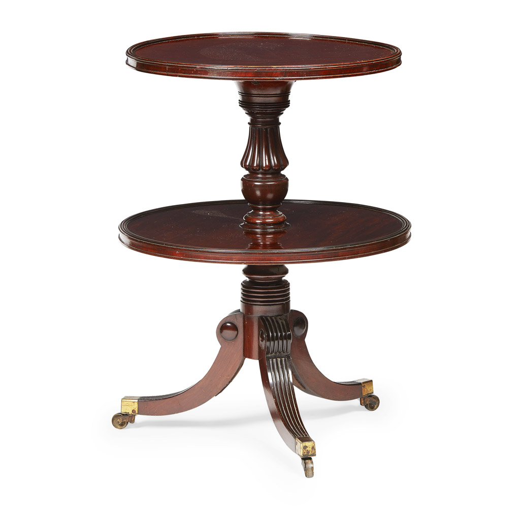 the circular top with a reeded rim above a boldly turned and reeded column and lower tier, raised on a tripod base with reeded sabre legs with brass caps and castors