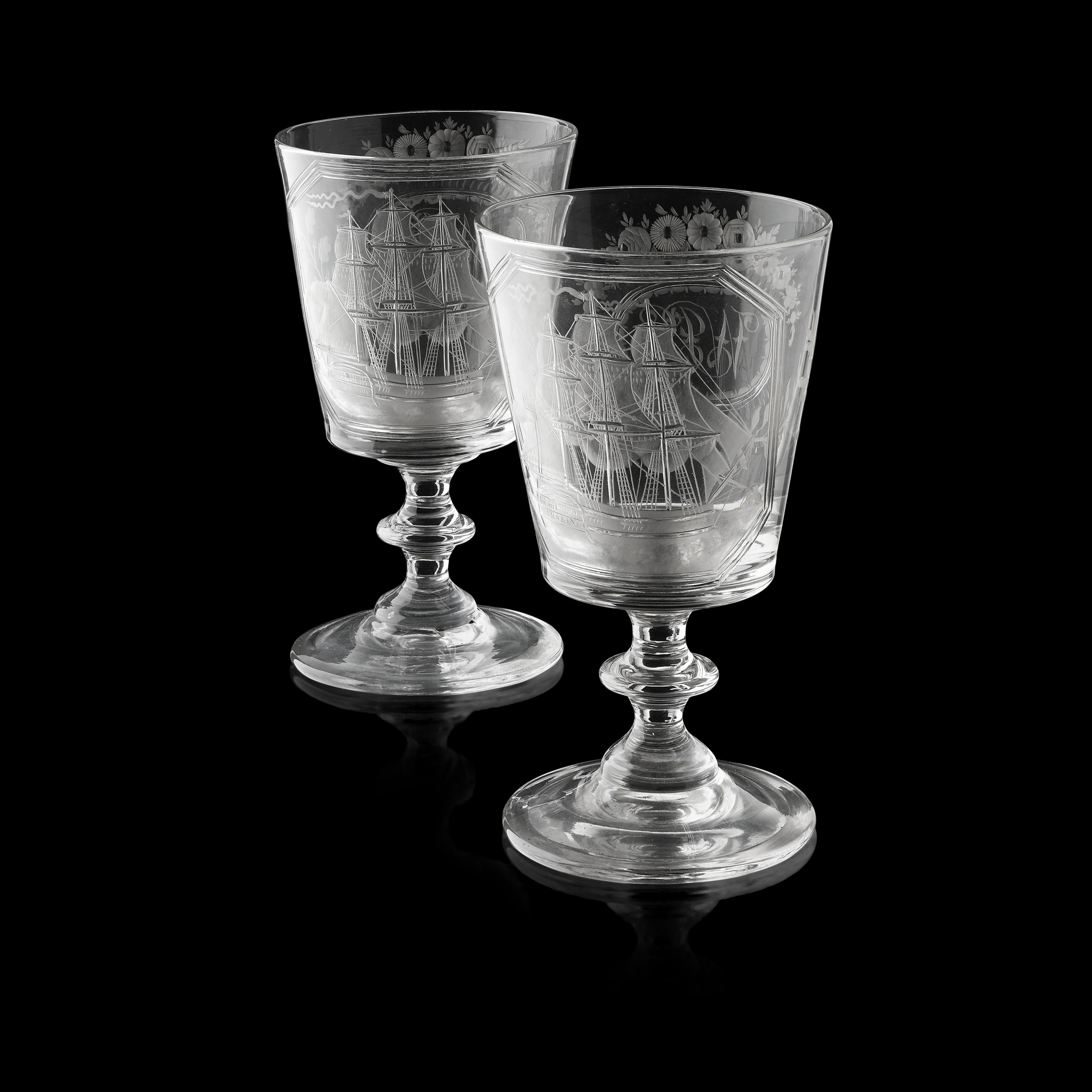 the tapered bowls engraved with a three masted sailing ship 'Caroline', the reverse with the monogram 'WJG' within an oval cartouche enclosed by laurel, oak leaves, and roses, on a knopped stem and slightly domed circular foot (2)