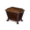 of sarcophagus form, with a leaf tip carved and hinged cover over panel sides, raised on carved paw feet