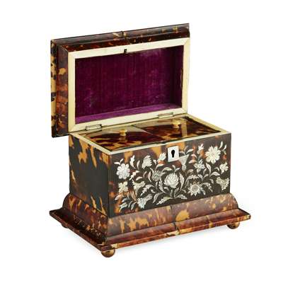 REGENCY TORTOISESHELL AND MOTHER-OF-PEARL INLAID TEA CADDY Y