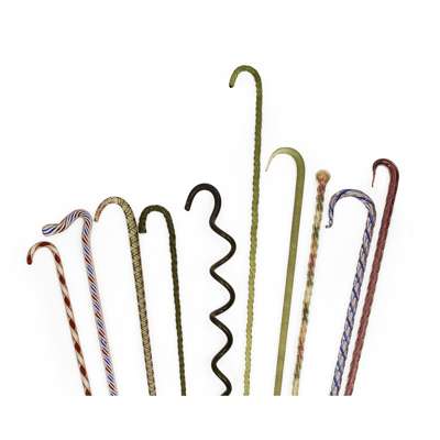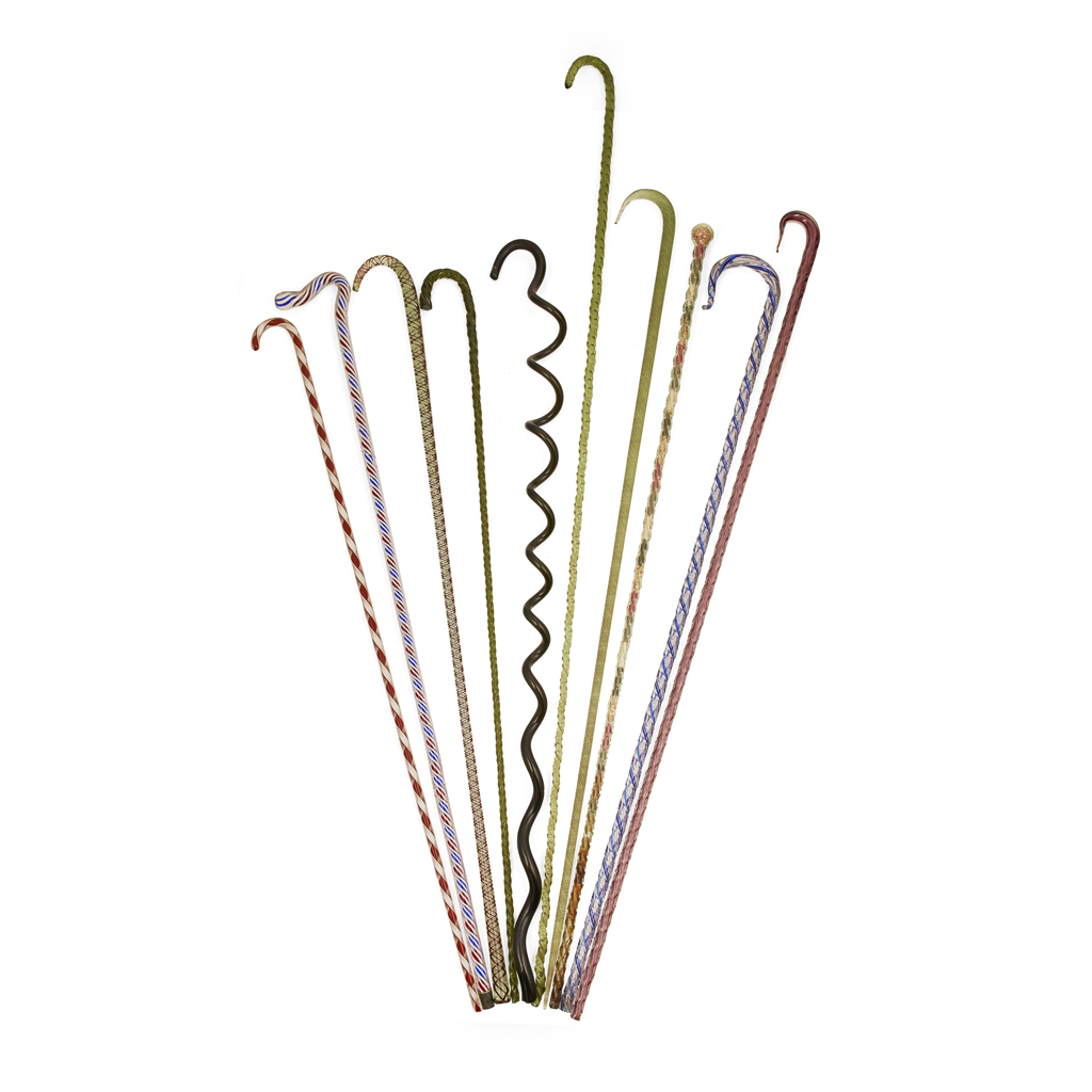 comprising an amethyst coloured stem cane, 107.5cm; a cane with a knop handle, filled with coloured sugar beads, 102cm; a double red twist cane, 95cm; a red, blue and white opaque twist cane, 94.5cm; two green glass wrythen form canes, 92cm and 125cm; a blue twist cane, 98.5cm; a green tinted glass cane, finely twisted, 106cm; a red and white opaque twist example, 90cm; and a green glass corkscrew twist cane, 95.5cm (10)