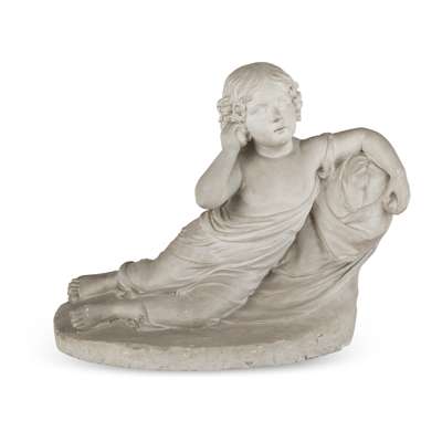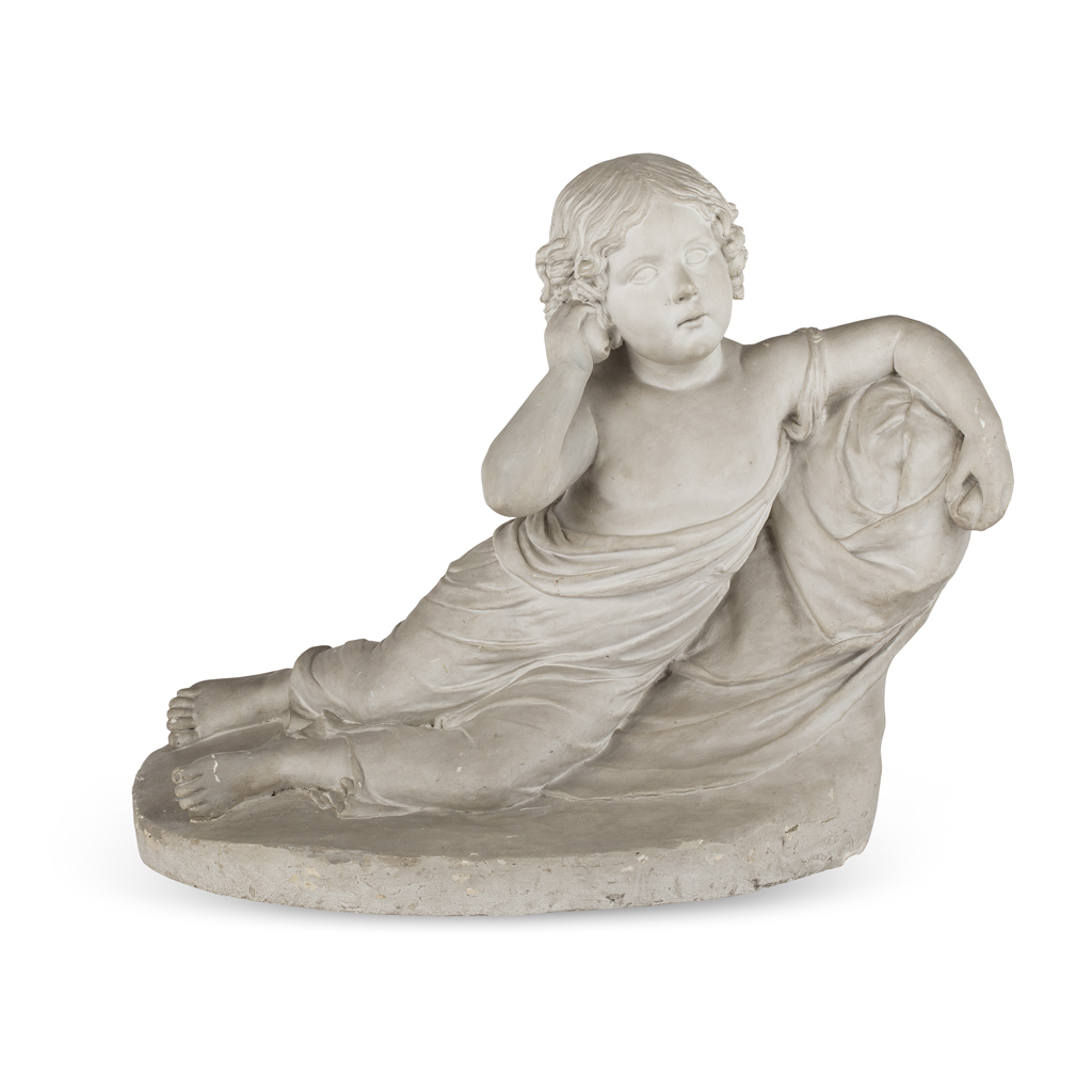 the reclining draped figure holding a shell to his ear in his right hand, on an oval base, unsigned