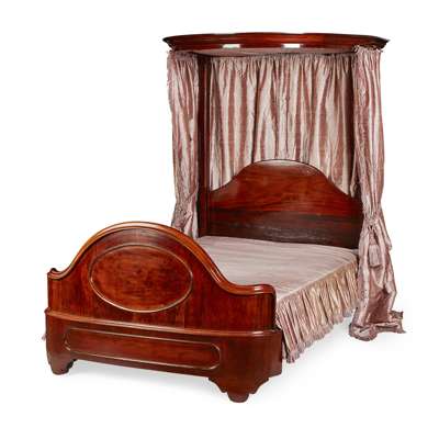 the demilune moulded tester above an arched headboard and matching curved moulded footboard. with pale pink dupioni silk hangings and modern fitted mattress