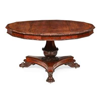 the sixteen sided tilt top with a carved and gadrooned edge, on a bold facetted and leaf carved column, raised on a triform base with carved paw feet and castors