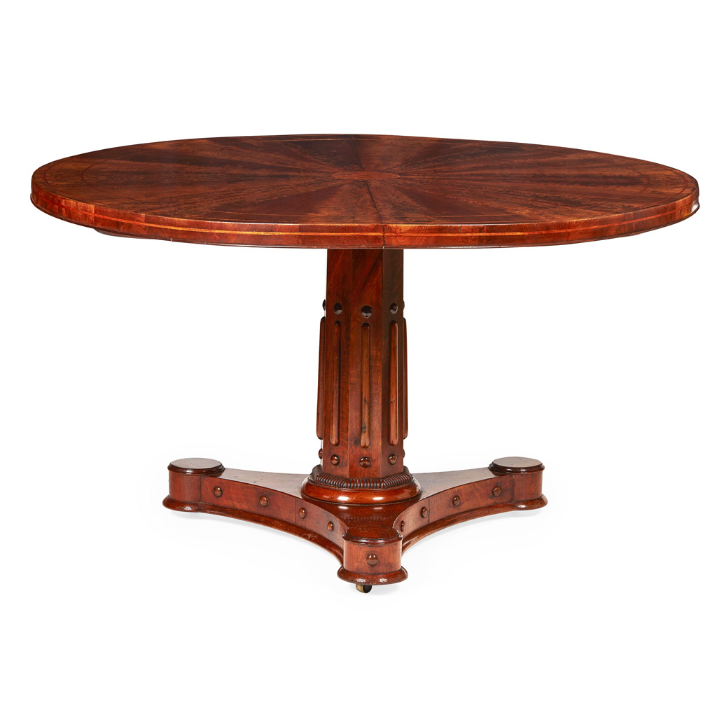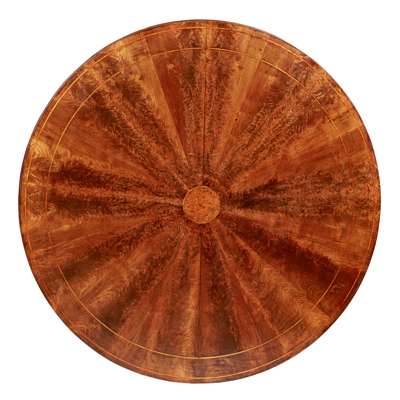 the circular top with radiating veneers and a central burrwood roundel and inlaid bands to the edge, raised on a facetted column with applied dot and bar mouldings on a concave triform base with turned disc feet with castors
