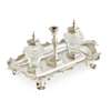 with scrolled twin handles and engraved decoration flanking two pen trays, removable taper stick and the later cut glass inkwells with original covers, with maker's marks and hallmarks