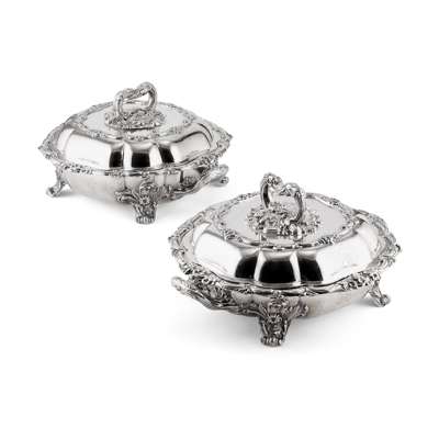 PAIR OF SILVER PLATED ENTREE DISHES, COVERS AND STANDS
