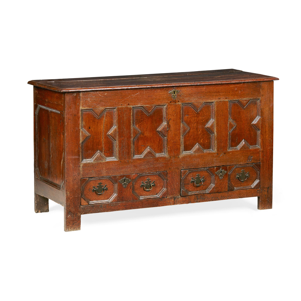 the hinged top over a four panel moulded front with a pair of base drawers, raised on stile feet