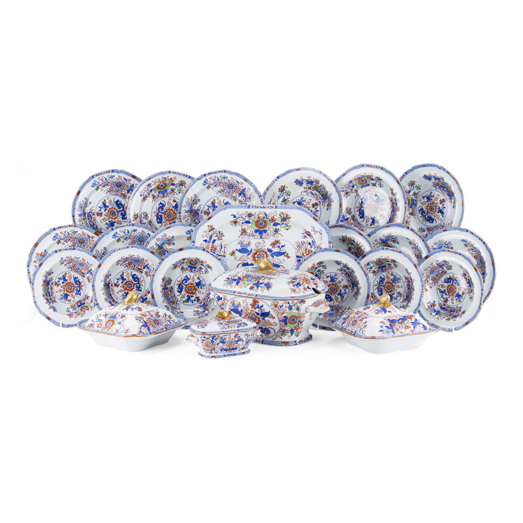 in the Imari palette, comprising a large covered tureen, a pair of covered vegetable dishes, a platter, a covered sauce boat, six dinner plates, six soup plates, and six dessert plates, blue printed mark, pattern 2054 (23)