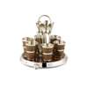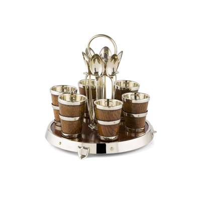 fitted with six gilt spoons in a central holder, on a circular oak base with gilt rim and six bucket shaped oak egg cups, raised three shield shaped feet