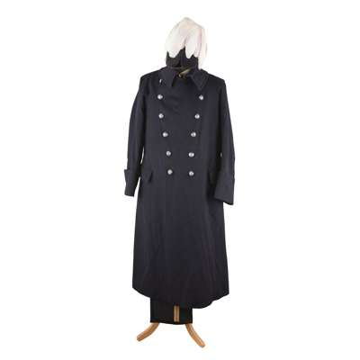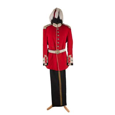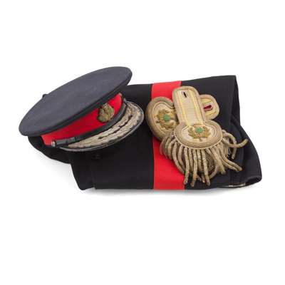 comprising a full dress tunic, with major's epaulettes; a cocked hat with feather plume; a peaked hat; a greatcoat; two pairs of trousers; a sword belt; further epaulettes; and a pair of spurs; contained in a painted metal trunk (qty)