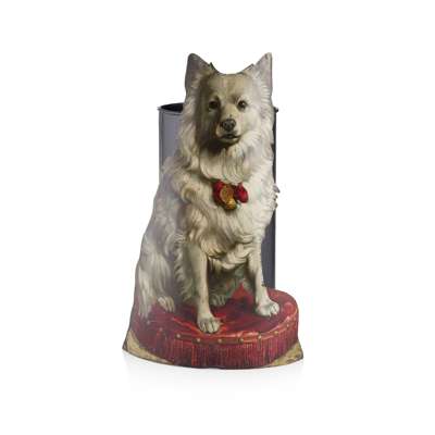 painted with a seated dog on a red cushion, with an associated removable liner