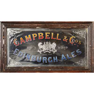 the rectangular mirror plate enamelled 'CAMPBELL & Co's / EDINBURGH ALES / Brewers to her Majesty est 1710' with an engraved coat of arms