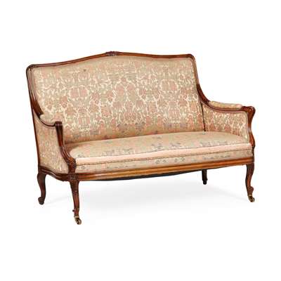 the low padded back above a stuffover seat and enclosed part padded arms, raised on acanthus carved cabriole legs with brass castors, the rear legs stamped '5075'; in floral Art Nouveau style upholstery