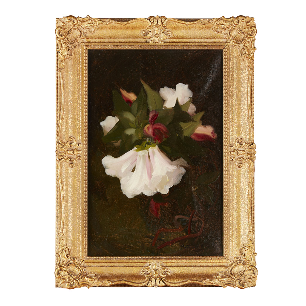 PINK AND WHITE FLOWERS, AGAINST A DARK BACKGROUND