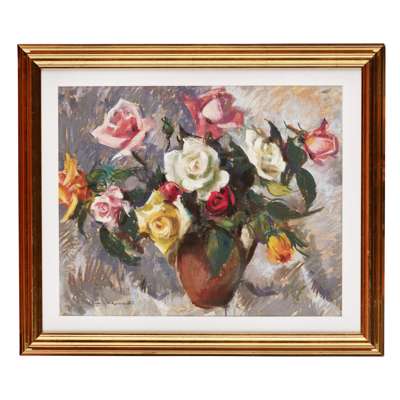 A VASE OF COLOURED ROSES