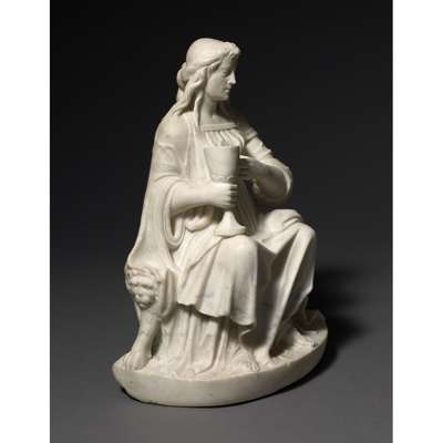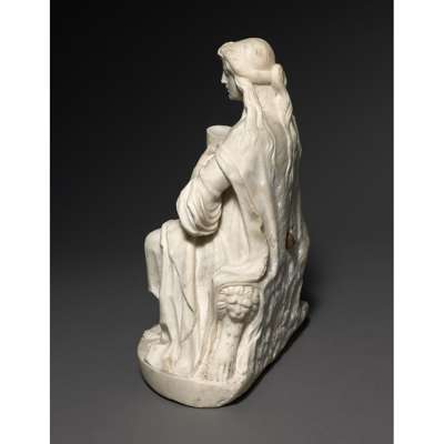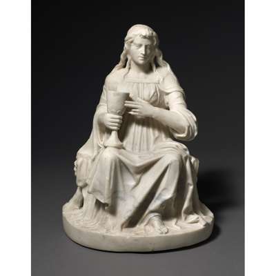 white marble, the seated figure dressed in flowing robes which drape across the knees, she holds a chalice in her right hand and gestures to it with her left, her long hair falling loosely on her shoulders while the rest is tied in a knot at the back of her head; the partially finished back with a metal fitting; on a shaped oval base