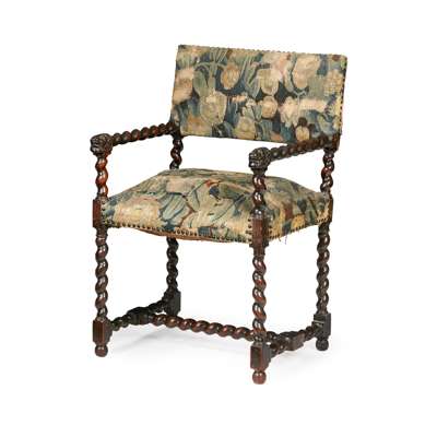 the square padded back above a wide stuffover seat, both covered in verdure tapestry upholstery, the spiral carved arms with carved lion head terminals, raised on spiral carved legs joined by an H stretcher