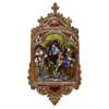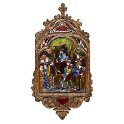 in multicolour enamels, depicting courtiers with swords, below cartouche plaques depicting God and angels with horns, bearing an indistinct signature P. COURTER, 1545, in a carved and gilt Baroque style limewood frame