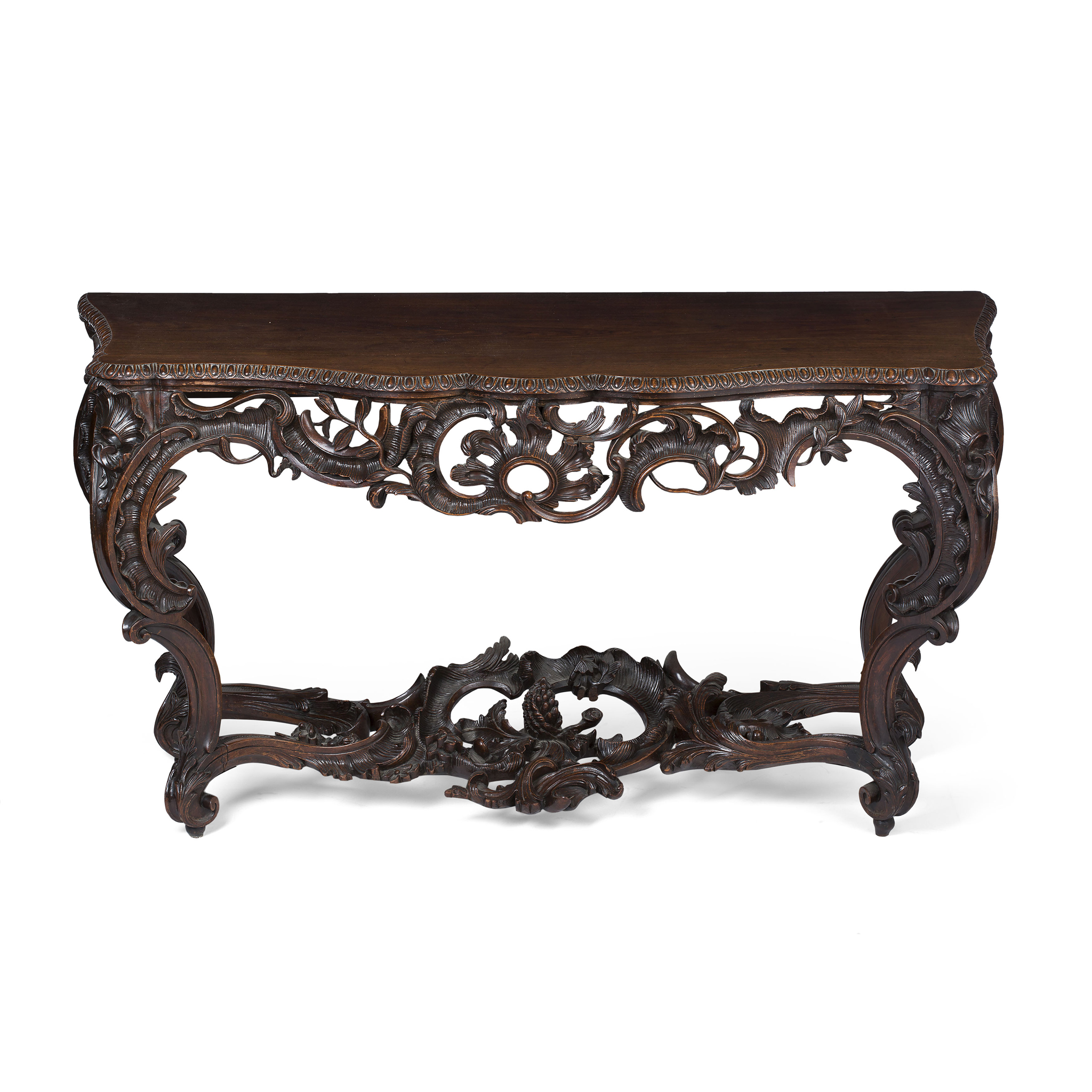 in the rococo style, the serpentine top with an egg and dart carved edge, over an openwork frieze boldly carved with C scrolls, shells, and foliate vines, raised on scrolled cabriole legs joined by a pierced and carved stretcher centred by fruit and foliate motifs