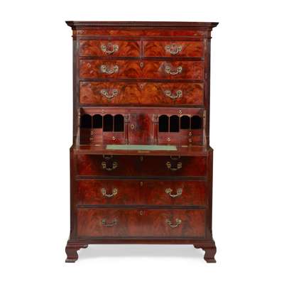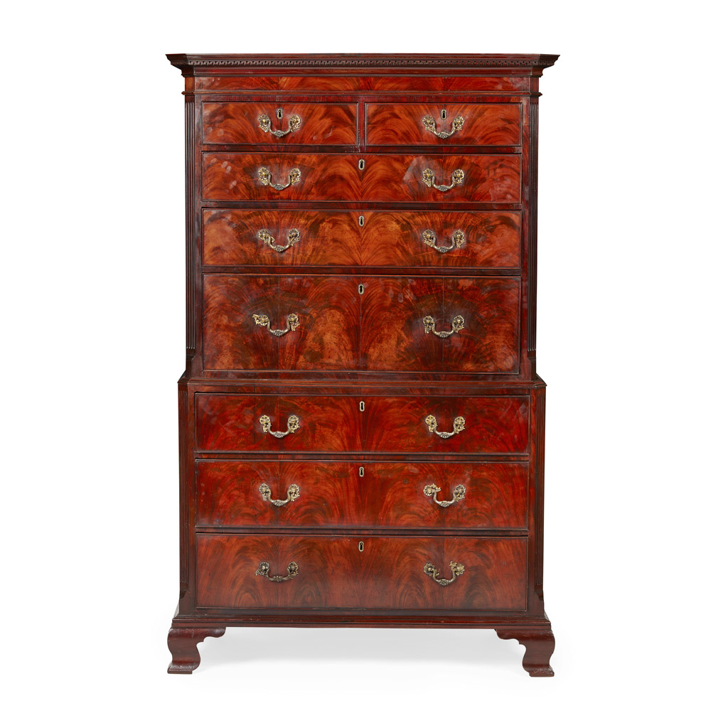 FINE GEORGE III FLAME MAHOGANY SECRETAIRE CHEST ON CHEST