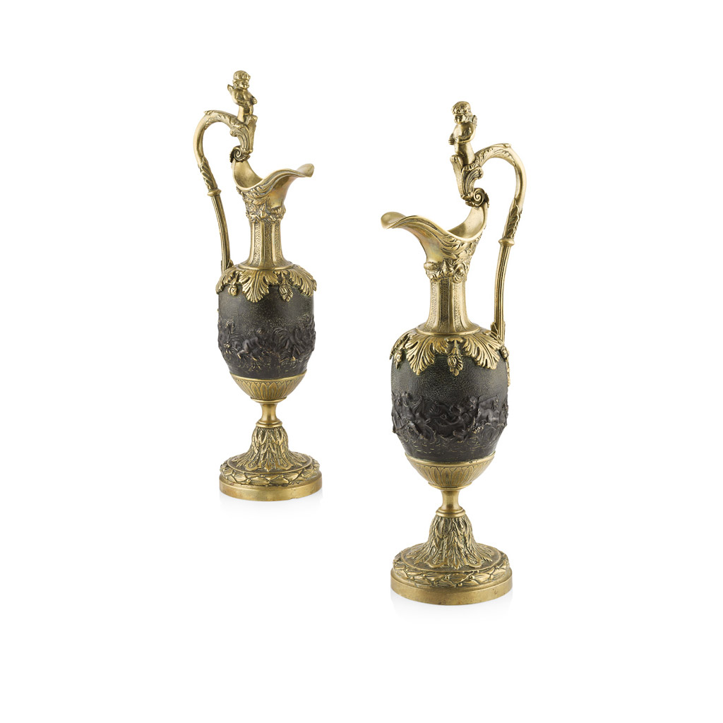 PAIR OF PATINATED AND POLISHED BRASS EWERS, AFTER CLODION