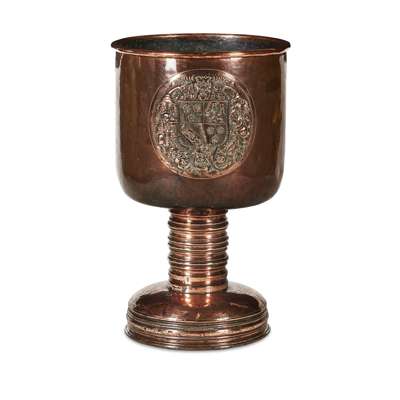 the deep circular top with an embossed heraldic crest for the Knights Templar, on a ring moulded support and domed foot
