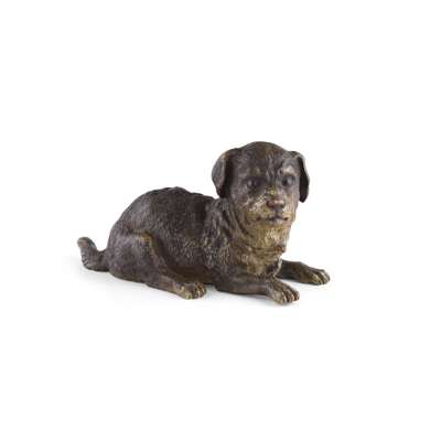 cast as a recumbent terrier, with a registration mark and impressed DÉPOSÉ