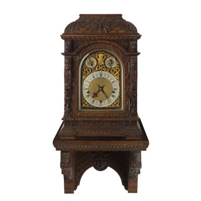 the pediment and case carved with masks and stylised foliage, enclosing three silvered dials and a gilt plate, with a retailers plaque for BARRIE & SON/ EDINBURGH, the chiming movement striking on a gong, stamped W&H SCH, together with a matching carved bracket