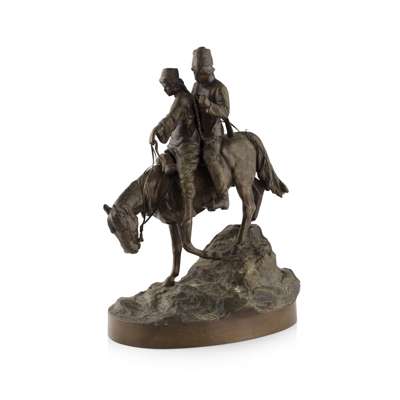 bronze, medium brown patina, modelled as a Cossack and companion on horseback, signed to A. M. BONEGOR