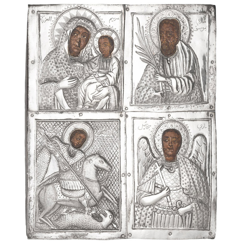 depicting the Neamts Mother of God, Saint George, the Archangel Michael, and a male martyred saint, each enclosed by a white metal repousse oklad